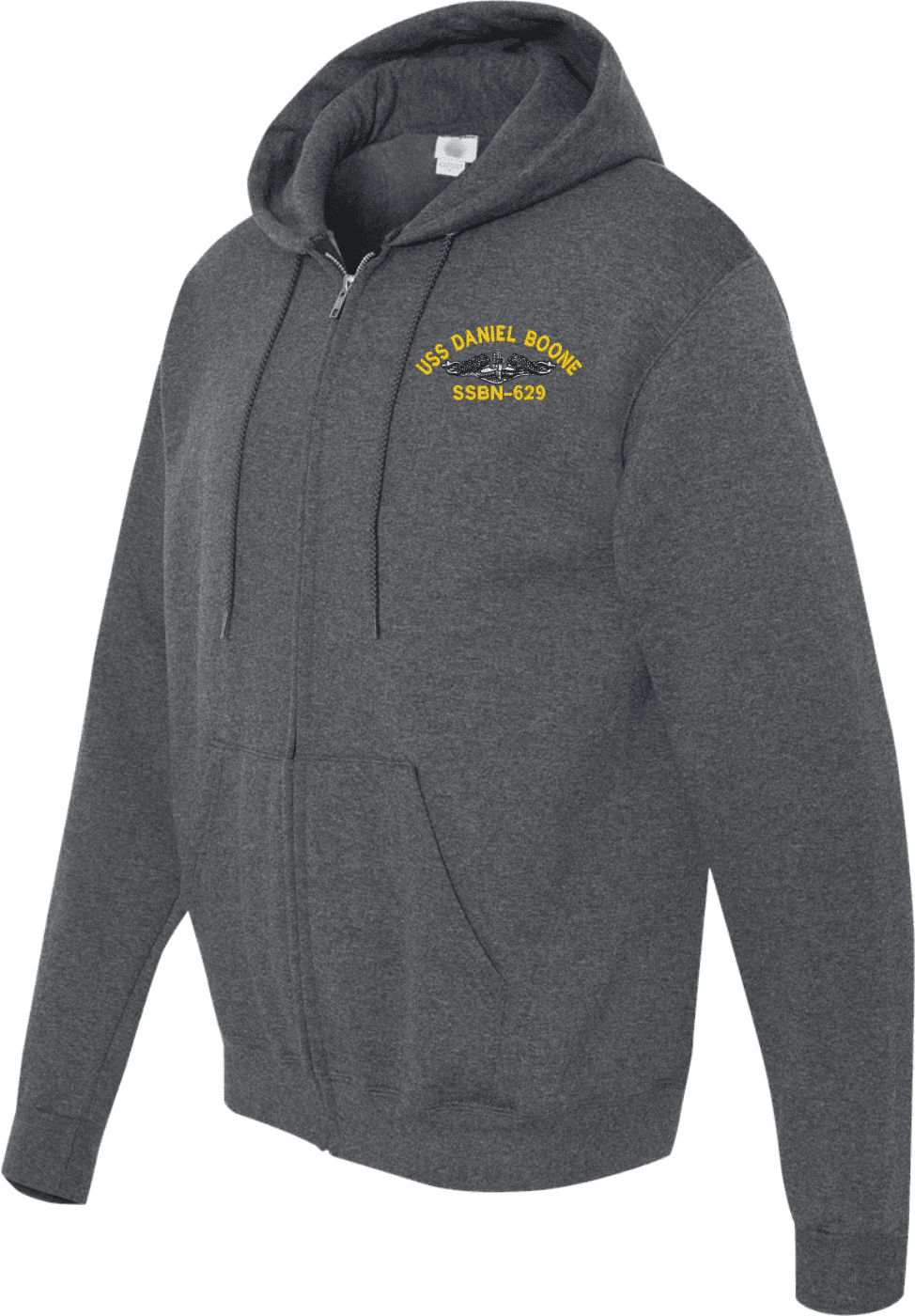 MilitaryBest has expanded its line of apparel with this custom embroidered USS Daniel Boone SSBN-629 with Dolphins Embroidered Zippered Hoodie. Each Hoodie is direct embroidered onto a Champion brand 9.5 oz 50/50 Cotton Poly blend. This will make an excellent addition to your wardrobe, or a great gift. Your satisfaction is Guaranteed! These quality zippered hoodies are proudly embroidered at our facilities in Scottsboro, AL. Support the Army MWR program by purchasing only from Licensed Vendors.