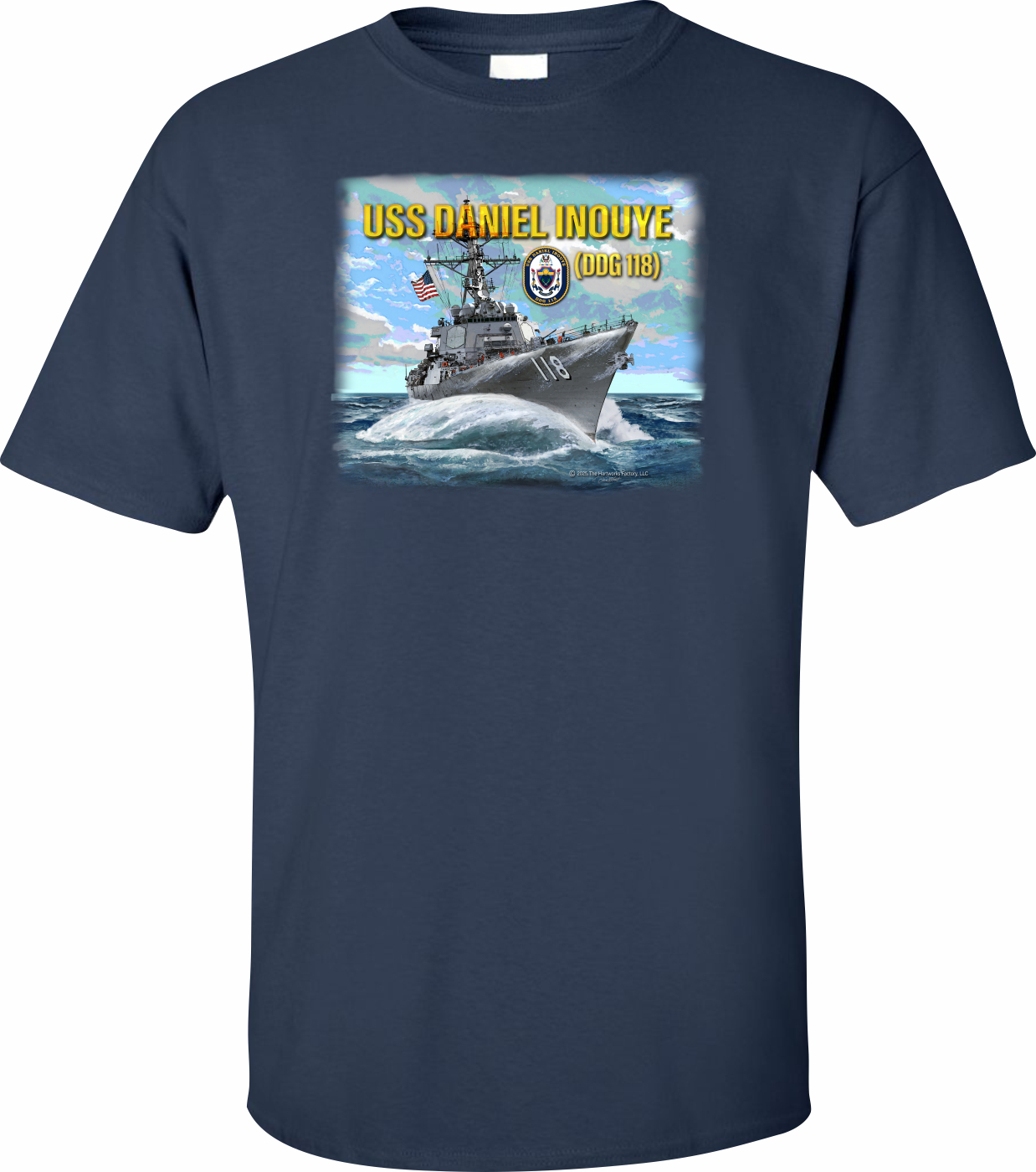 MilitaryBest is proud to offer this fine USS Daniel Inouye DDG-118 Printed Art T-Shirt. This shirt features a full front print, with beautiful artwork designed by licensed Navy artist David Hart. This shirt is available in black and navy blue colors. Each T-shirt is proudly printed in the USA.Unless there is a defect in workmanship or material, these shirts are unreturnable.