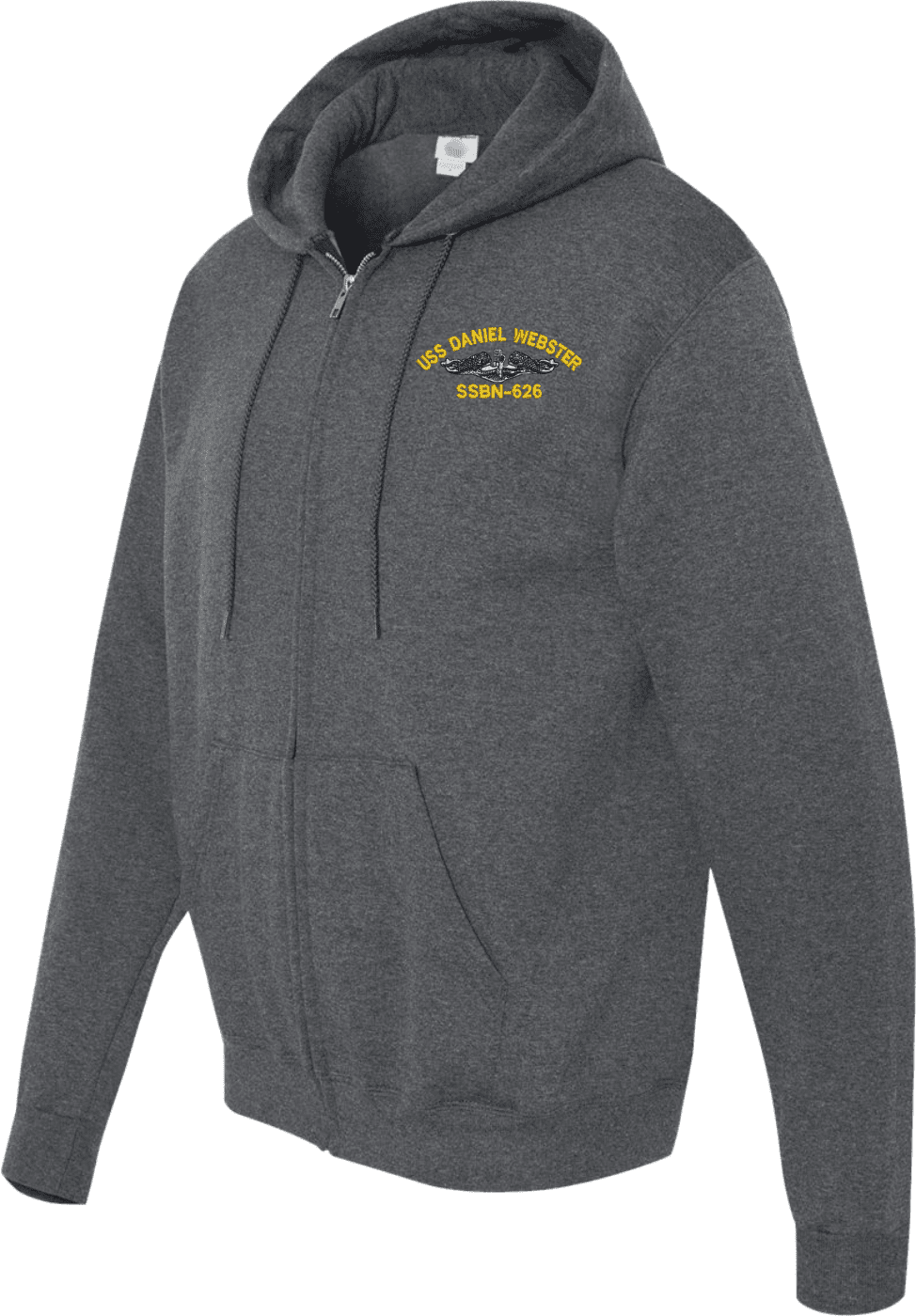 MilitaryBest has expanded its line of apparel with this custom embroidered USS Daniel Webster SSBN-626 with Dolphins Embroidered Zippered Hoodie. Each Hoodie is direct embroidered onto a Champion brand 9.5 oz 50/50 Cotton Poly blend. This will make an excellent addition to your wardrobe, or a great gift. Your satisfaction is Guaranteed! These quality zippered hoodies are proudly embroidered at our facilities in Scottsboro, AL. Support the Army MWR program by purchasing only from Licensed Vendors.