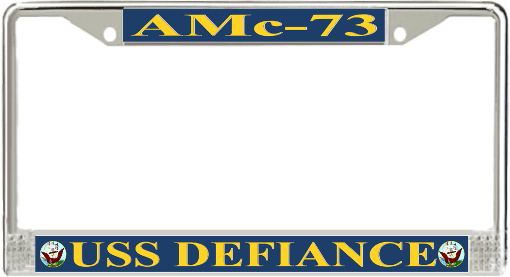 USS Defiance AMc-73 License Plate FrameThis USS Defiance AMc-73 License Plate Frame is proudly made in the USA at our facilities in Scottsboro, Alabama. Each of our MilitaryBest U.S. Navy Frames feature top and bottom Poly Coated Aluminum strips that are printed using sublimation which gives these quality automobile military frames a beautiful high gloss finish.