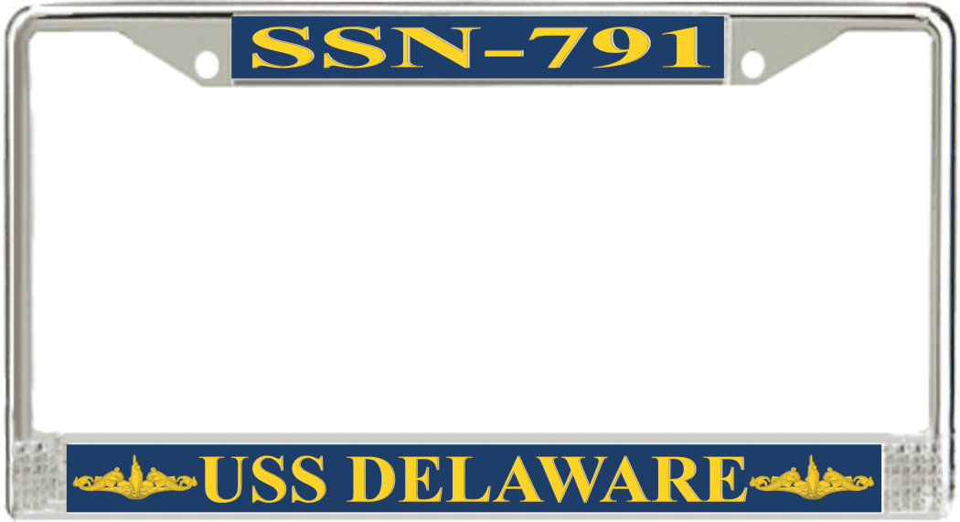 USS Delaware SSN-791 License Plate Frame This USS Delaware SSN-791 License Plate Frame is proudly made in the USA at our facilities in Scottsboro, Alabama. Each Frame features top and bottom sublimated design strips that are poly coated for a protective gloss finish. Please check your state and local regulations for compatibility of these frames for use on your vehicle.