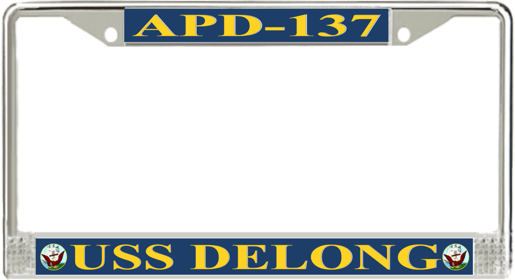 USS DeLong APD-137 License Plate FrameThis USS DeLong APD-137 License Plate Frame is proudly made in the USA at our facilities in Scottsboro, Alabama. Each of our MilitaryBest U.S. Navy Frames feature top and bottom Poly Coated Aluminum strips that are printed using sublimation which gives these quality automobile military frames a beautiful high gloss finish.