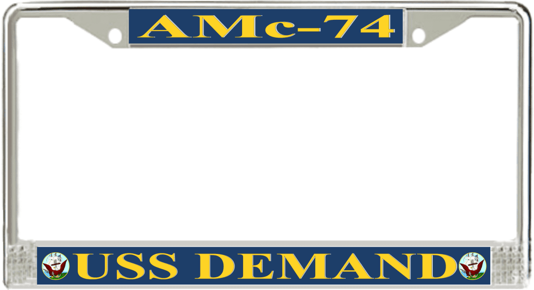 USS Demand AMc-74 License Plate FrameThis USS Demand AMc-74 License Plate Frame is proudly made in the USA at our facilities in Scottsboro, Alabama. Each of our MilitaryBest U.S. Navy Frames feature top and bottom Poly Coated Aluminum strips that are printed using sublimation which gives these quality automobile military frames a beautiful high gloss finish.