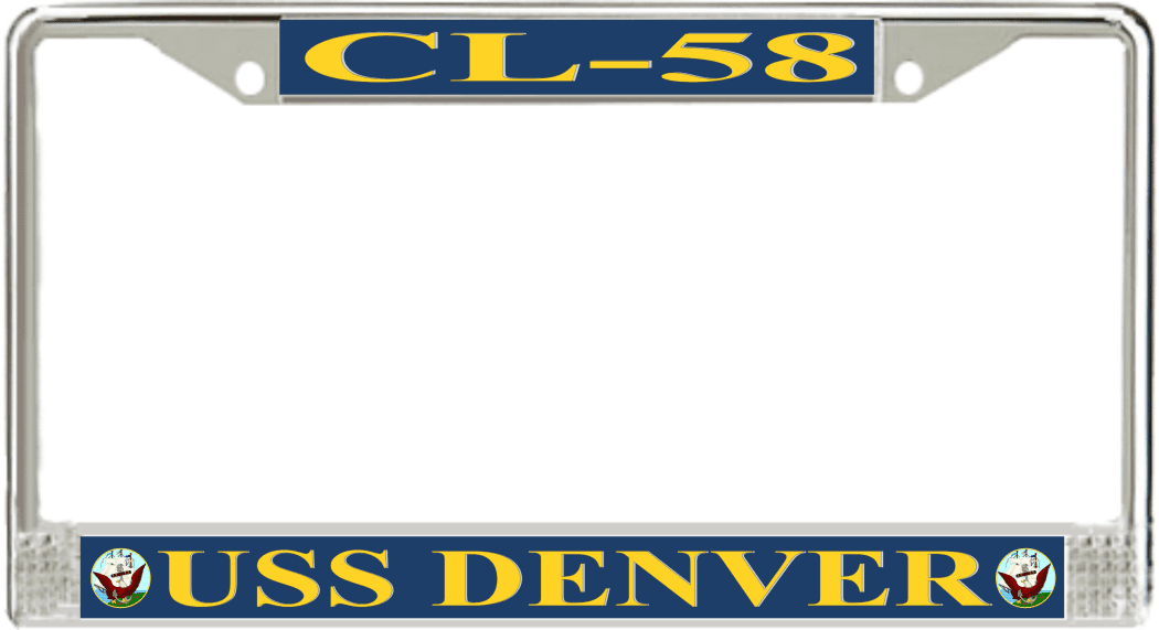 USS Denver CL-58 License Plate FrameThis USS Denver CL-58 License Plate Frame is proudly made in the USA at our facilities in Scottsboro, Alabama. Each of our MilitaryBest U.S. Navy Frames feature top and bottom Poly Coated Aluminum strips that are printed using sublimation which gives these quality automobile military frames a beautiful high gloss finish.