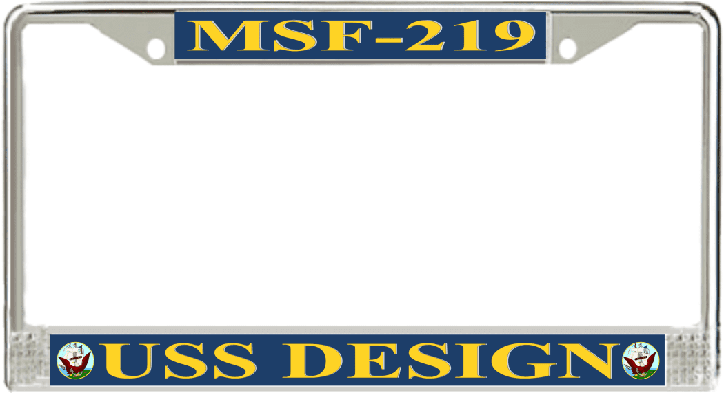USS Design MSF-219 License Plate FrameThis USS Design MSF-219 License Plate Frame is proudly made in the USA at our facilities in Scottsboro, Alabama. Each of our MilitaryBest U.S. Navy Frames feature top and bottom Poly Coated Aluminum strips that are printed using sublimation which gives these quality automobile military frames a beautiful high gloss finish.