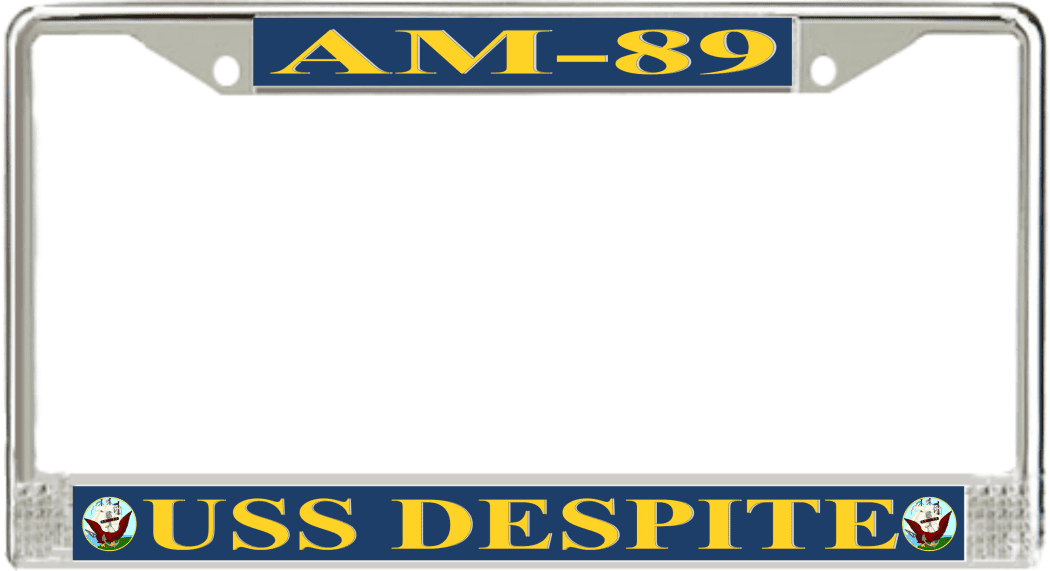 USS Despite AM-89 License Plate FrameThis USS Despite AM-89 License Plate Frame is proudly made in the USA at our facilities in Scottsboro, Alabama. Each of our MilitaryBest U.S. Navy Frames feature top and bottom Poly Coated Aluminum strips that are printed using sublimation which gives these quality automobile military frames a beautiful high gloss finish.