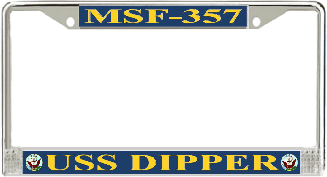 USS Dipper MSF-357 License Plate FrameThis USS Dipper MSF-357 License Plate Frame is proudly made in the USA at our facilities in Scottsboro, Alabama. Each of our MilitaryBest U.S. Navy Frames feature top and bottom Poly Coated Aluminum strips that are printed using sublimation which gives these quality automobile military frames a beautiful high gloss finish.