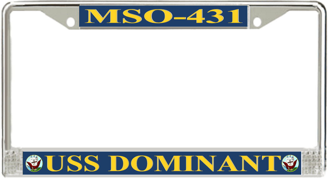 USS Dominant MSO-431 License Plate FrameThis USS Dominant MSO-431 License Plate Frame is proudly made in the USA at our facilities in Scottsboro, Alabama. Each of our MilitaryBest U.S. Navy Frames feature top and bottom Poly Coated Aluminum strips that are printed using sublimation which gives these quality automobile military frames a beautiful high gloss finish.