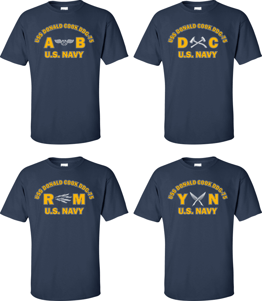 Due to disruptions in supply chains, this design will be embroidered on a Champion, Gildan, Jerzees or comparable brand.Proudly display your ship and rate with our top quality USS DONALD COOK DDG-75 Rates t-shirts, sweatshirts, and hoodies. These fine U.S. Navy apparel items will make you the envy of your veteran buddies, or will make a fine gift! Our USS DONALD COOK DDG-75 shirts are proudly printed in the USA!