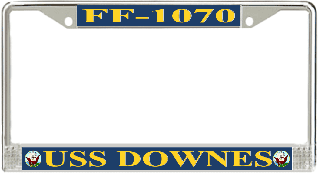 USS Downes FF-1070 License Plate FrameThis USS Downes FF-1070 License Plate Frame is proudly made in the USA at our facilities in Scottsboro, Alabama. Each of our MilitaryBest U.S. Navy Frames feature top and bottom Poly Coated Aluminum strips that are printed using sublimation which gives these quality automobile military frames a beautiful high gloss finish.