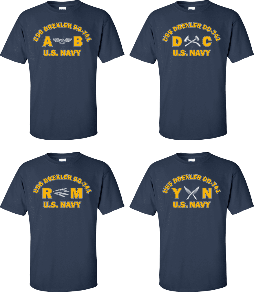 Due to disruptions in supply chains, this design will be embroidered on a Champion, Gildan, Jerzees or comparable brand.Proudly display your ship and rate with our top quality USS DREXLER DD-741 Rates t-shirts, sweatshirts, and hoodies. These fine U.S. Navy apparel items will make you the envy of your veteran buddies, or will make a fine gift! Our USS DREXLER DD-741 shirts are proudly printed in the USA!