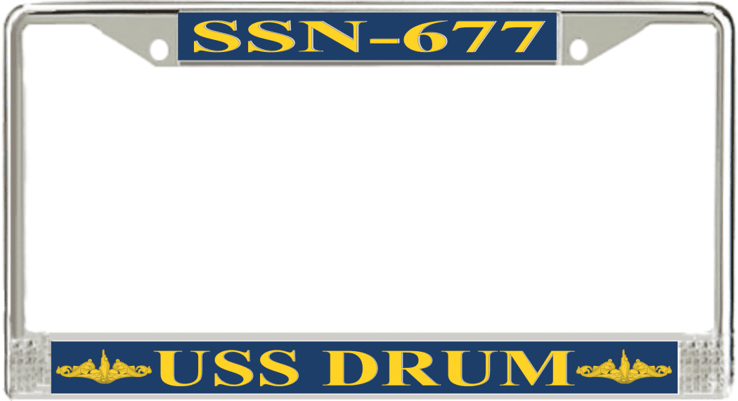 USS Drum SSN-677 License Plate Frame This USS Drum SSN-677 License Plate Frame is proudly made in the USA at our facilities in Scottsboro, Alabama. Each Frame features top and bottom sublimated design strips that are poly coated for a protective gloss finish. Please check your state and local regulations for compatibility of these frames for use on your vehicle.