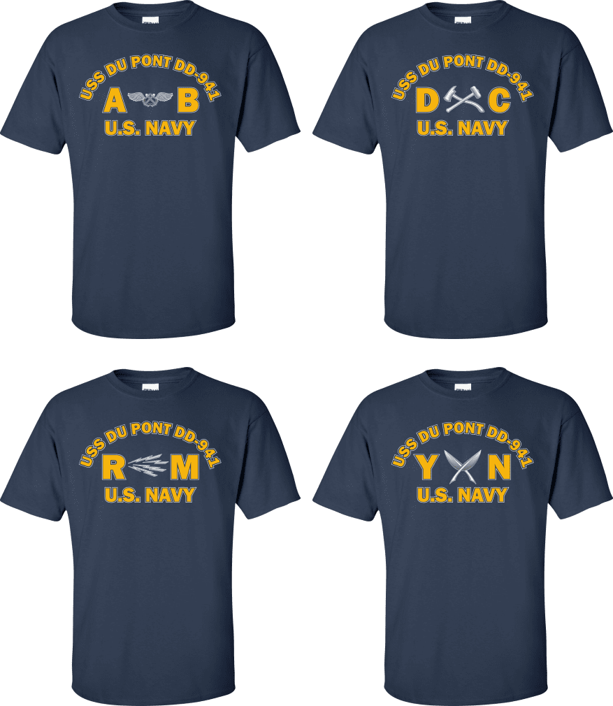 Due to disruptions in supply chains, this design will be embroidered on a Champion, Gildan, Jerzees or comparable brand.Proudly display your ship and rate with our top quality USS DU PONT DD-941 Rates t-shirts, sweatshirts, and hoodies. These fine U.S. Navy apparel items will make you the envy of your veteran buddies, or will make a fine gift! Our USS DU PONT DD-941 shirts are proudly printed in the USA!