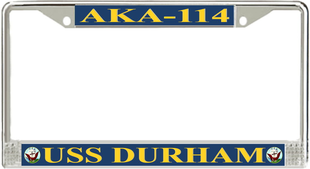 USS Durham AKA-114 License Plate FrameThis USS Durham AKA-114 License Plate Frame is proudly made in the USA at our facilities in Scottsboro, Alabama. Each of our MilitaryBest U.S. Navy Frames feature top and bottom Poly Coated Aluminum strips that are printed using sublimation which gives these quality automobile military frames a beautiful high gloss finish.
