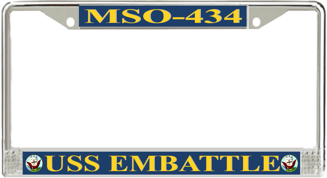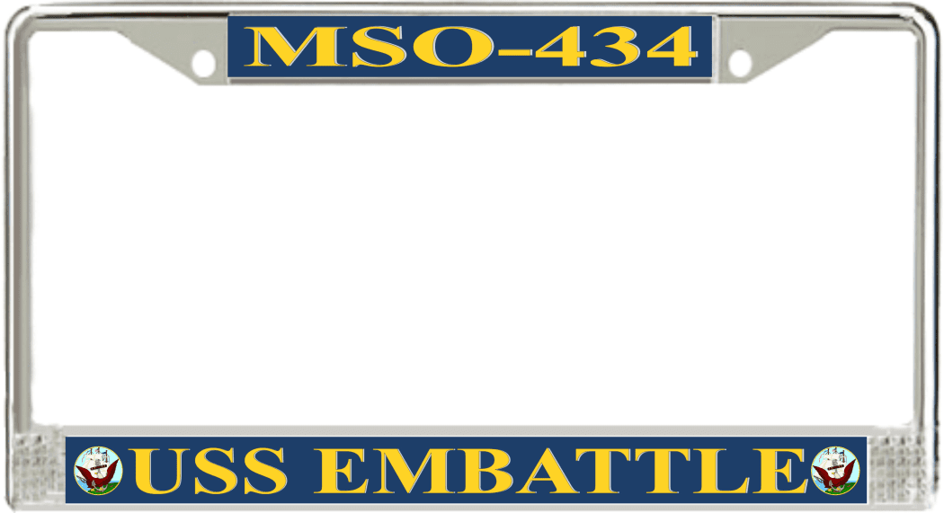 USS Embattle MSO-434 License Plate FrameThis USS Embattle MSO-434 License Plate Frame is proudly made in the USA at our facilities in Scottsboro, Alabama. Each of our MilitaryBest U.S. Navy Frames feature top and bottom Poly Coated Aluminum strips that are printed using sublimation which gives these quality automobile military frames a beautiful high gloss finish.