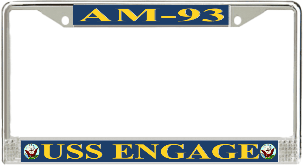 USS Engage AM-93 License Plate FrameThis USS Engage AM-93 License Plate Frame is proudly made in the USA at our facilities in Scottsboro, Alabama. Each of our MilitaryBest U.S. Navy Frames feature top and bottom Poly Coated Aluminum strips that are printed using sublimation which gives these quality automobile military frames a beautiful high gloss finish.