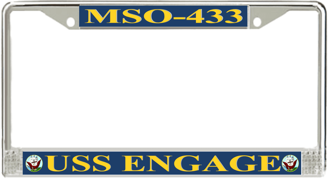 USS Engage MSO-433 License Plate FrameThis USS Engage MSO-433 License Plate Frame is proudly made in the USA at our facilities in Scottsboro, Alabama. Each of our MilitaryBest U.S. Navy Frames feature top and bottom Poly Coated Aluminum strips that are printed using sublimation which gives these quality automobile military frames a beautiful high gloss finish.