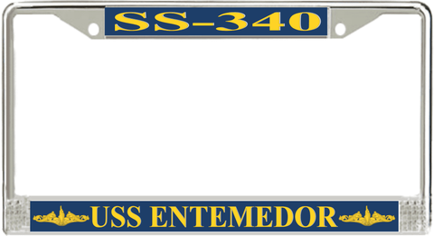 USS Entemedor SS-340 License Plate Frame This USS Entemedor SS-340 License Plate Frame is proudly made in the USA at our facilities in Scottsboro, Alabama. Each Frame features top and bottom sublimated design strips that are poly coated for a protective gloss finish. Please check your state and local regulations for compatibility of these frames for use on your vehicle.