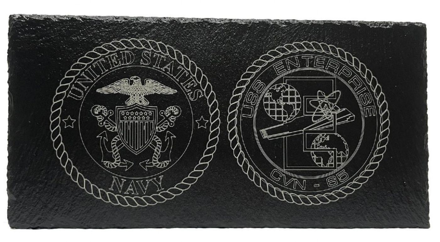 We are proud to offer this laser engraved slate plaque. This USS Enterprise CVN-65 Officer Plaque is engraved on a 12 x 6 inch piece of slate that offers a rustic and classic way to display on your desktop or book shelf. All plaques come with a black metal three leg stand. This plaque is Offically Licensed product by the Navy and made in the USA.