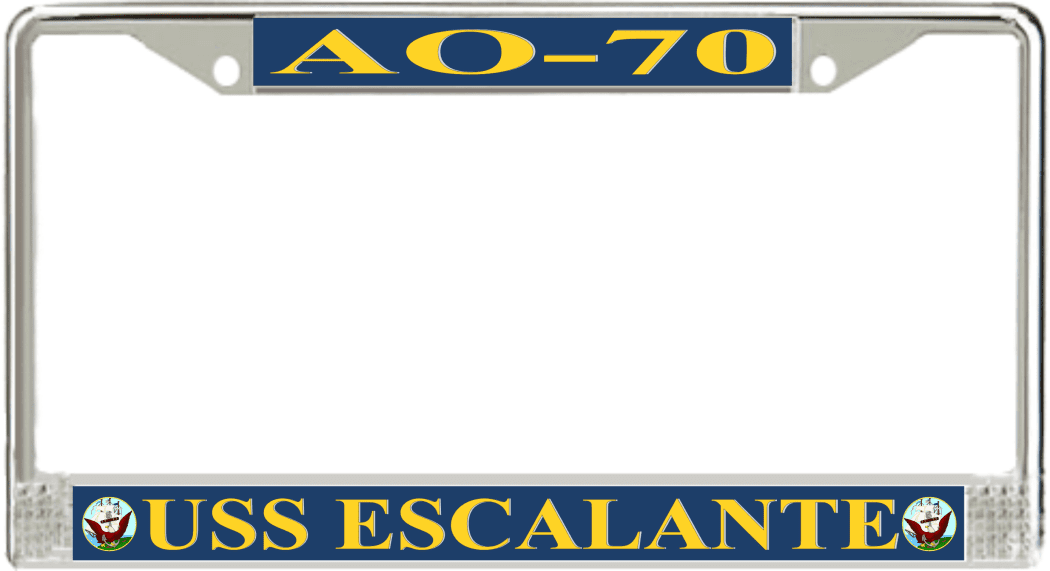 USS Escalante AO-70 License Plate FrameThis USS Escalante AO-70 License Plate Frame is proudly made in the USA at our facilities in Scottsboro, Alabama. Each of our MilitaryBest U.S. Navy Frames feature top and bottom Poly Coated Aluminum strips that are printed using sublimation which gives these quality automobile military frames a beautiful high gloss finish.