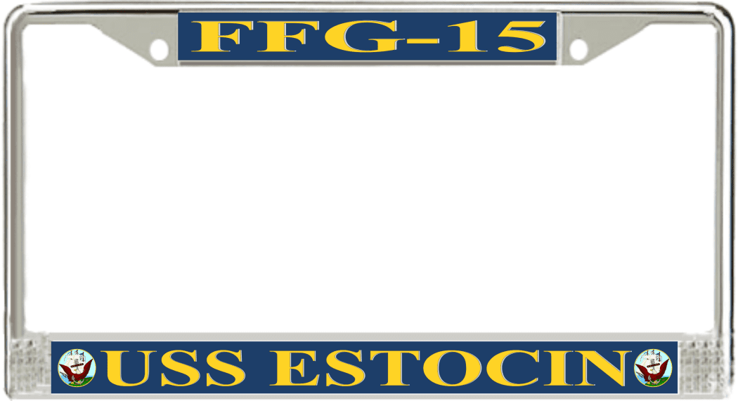 USS Estocin FFG-15 License Plate FrameThis USS Estocin FFG-15 License Plate Frame is proudly made in the USA at our facilities in Scottsboro, Alabama. Each of our MilitaryBest U.S. Navy Frames feature top and bottom Poly Coated Aluminum strips that are printed using sublimation which gives these quality automobile military frames a beautiful high gloss finish.