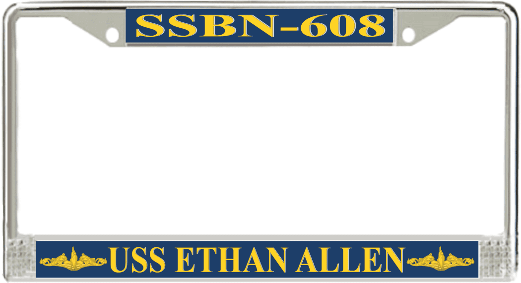 USS Ethan Allen SSBN-608 License Plate Frame This USS Ethan Allen SSBN-608 License Plate Frame is proudly made in the USA at our facilities in Scottsboro, Alabama. Each Frame features top and bottom sublimated design strips that are poly coated for a protective gloss finish. Please check your state and local regulations for compatibility of these frames for use on your vehicle.