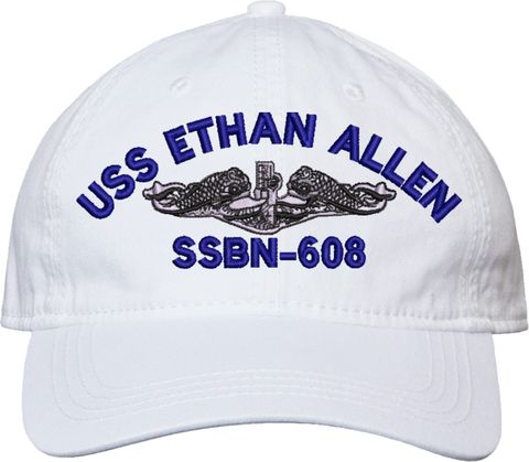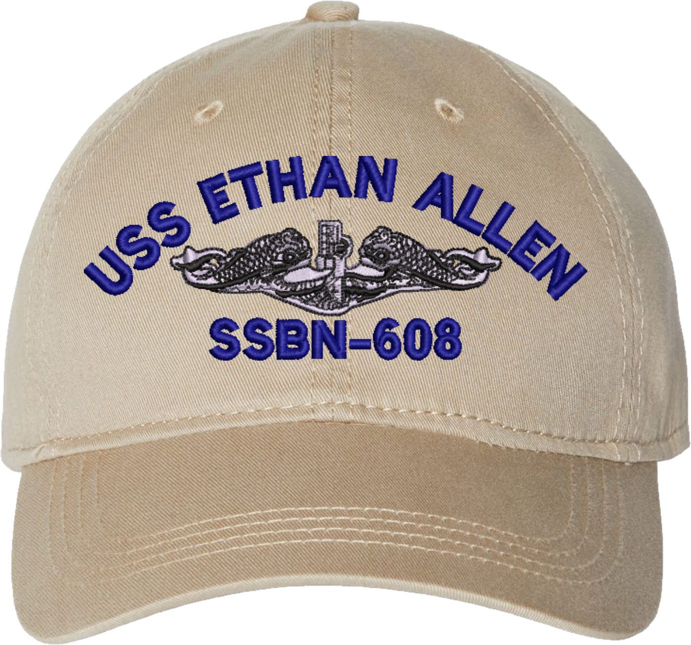 Show your Navy pride with this USS Ethan Allen SSBN-608 with Dolphins Unstructured Dad Cap from MilitaryBest. Crafted from 100% washed chino twill cotton, this six-panel, low-profile cap offers a relaxed and comfortable fit. Featuring high-quality embroidery done in our Scottsboro, Alabama facility, this cap is designed with a pre-curved visor and an adjustable tri-glide buckle closure for a perfect fit. Whether for everyday wear or as a meaningful gift, this cap is a great way to honor your own or a loved one's service.For caps ordered with custom embroidered personalized text please allow an additional 3 to 5 days production time. All custom back text will be embroidered in ALL CAPITAL LETTERS. Caps with back text or eggs are non-returnable unless there is a material defect in the cap.