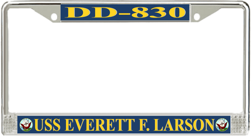 USS Everett F. Larson DD-830 License Plate FrameThis USS Everett F. Larson DD-830 License Plate Frame is proudly made in the USA at our facilities in Scottsboro, Alabama. Each of our MilitaryBest U.S. Navy Frames feature top and bottom Poly Coated Aluminum strips that are printed using sublimation which gives these quality automobile military frames a beautiful high gloss finish.
