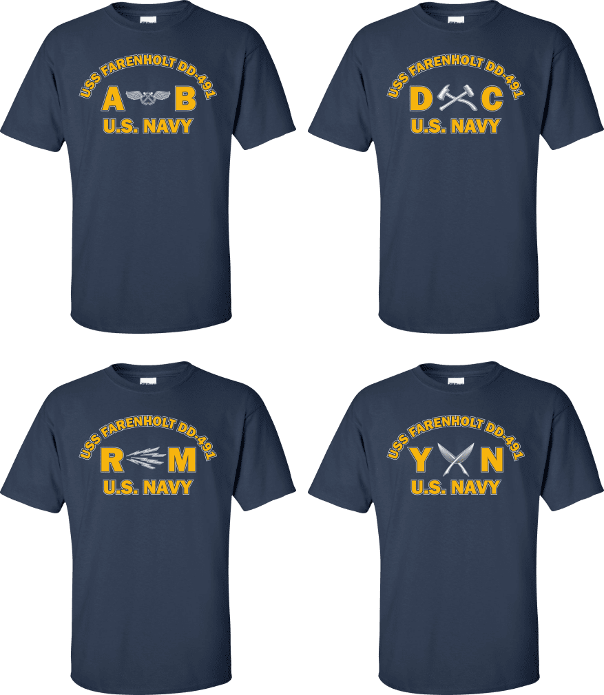 Due to disruptions in supply chains, this design will be embroidered on a Champion, Gildan, Jerzees or comparable brand.Proudly display your ship and rate with our top quality USS FARENHOLT DD-491 Rates t-shirts, sweatshirts, and hoodies. These fine U.S. Navy apparel items will make you the envy of your veteran buddies, or will make a fine gift! Our USS FARENHOLT DD-491 shirts are proudly printed in the USA!