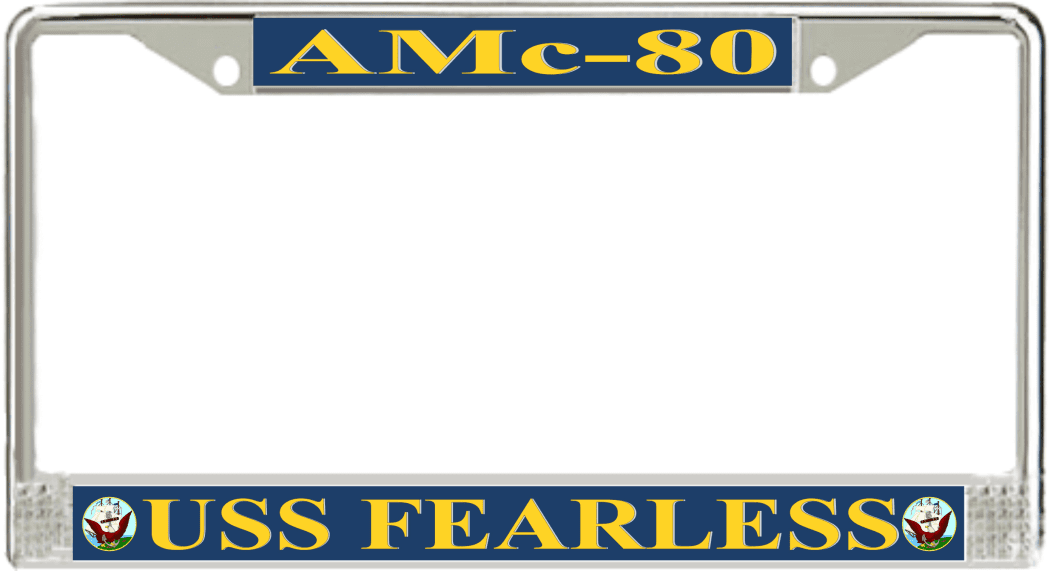 USS Fearless AMc-80 License Plate FrameThis USS Fearless AMc-80 License Plate Frame is proudly made in the USA at our facilities in Scottsboro, Alabama. Each of our MilitaryBest U.S. Navy Frames feature top and bottom Poly Coated Aluminum strips that are printed using sublimation which gives these quality automobile military frames a beautiful high gloss finish.