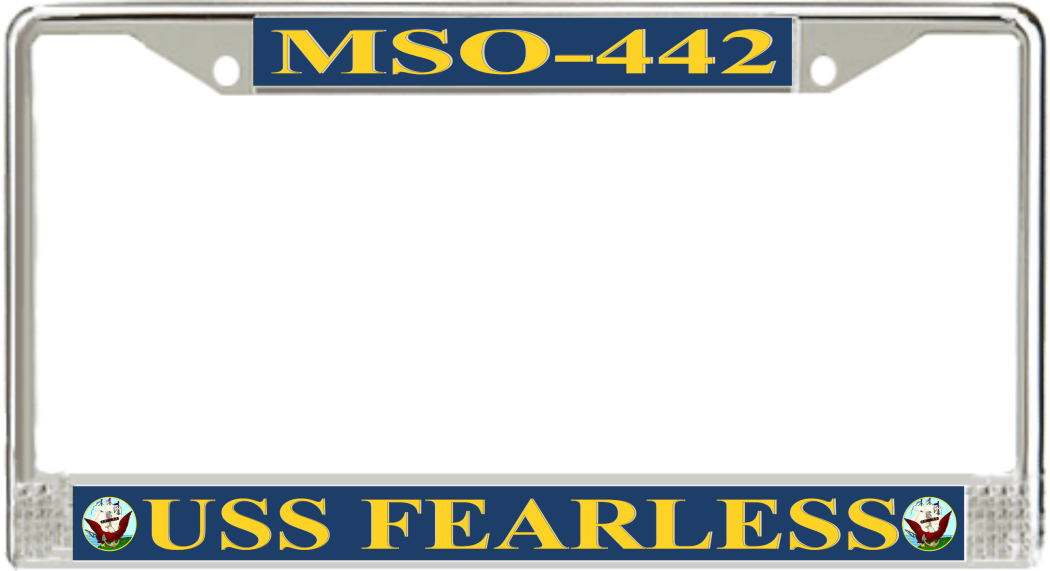 USS Fearless MSO-442 License Plate FrameThis USS Fearless MSO-442 License Plate Frame is proudly made in the USA at our facilities in Scottsboro, Alabama. Each of our MilitaryBest U.S. Navy Frames feature top and bottom Poly Coated Aluminum strips that are printed using sublimation which gives these quality automobile military frames a beautiful high gloss finish.