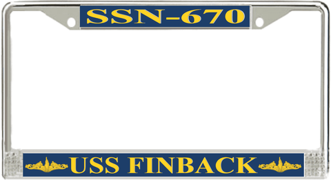 USS Finback SSN-670 License Plate Frame This USS Finback SSN-670 License Plate Frame is proudly made in the USA at our facilities in Scottsboro, Alabama. Each Frame features top and bottom sublimated design strips that are poly coated for a protective gloss finish. Please check your state and local regulations for compatibility of these frames for use on your vehicle.