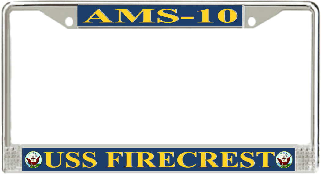 USS Firecrest AMS-10 License Plate Frame This USS Firecrest AMS-10 License Plate Frame is proudly made in the USA at our facilities in Scottsboro, Alabama. Each Frame features top and bottom sublimated design strips that are poly coated for a protective gloss finish. Please check your state and local regulations for compatibility of these frames for use on your vehicle.