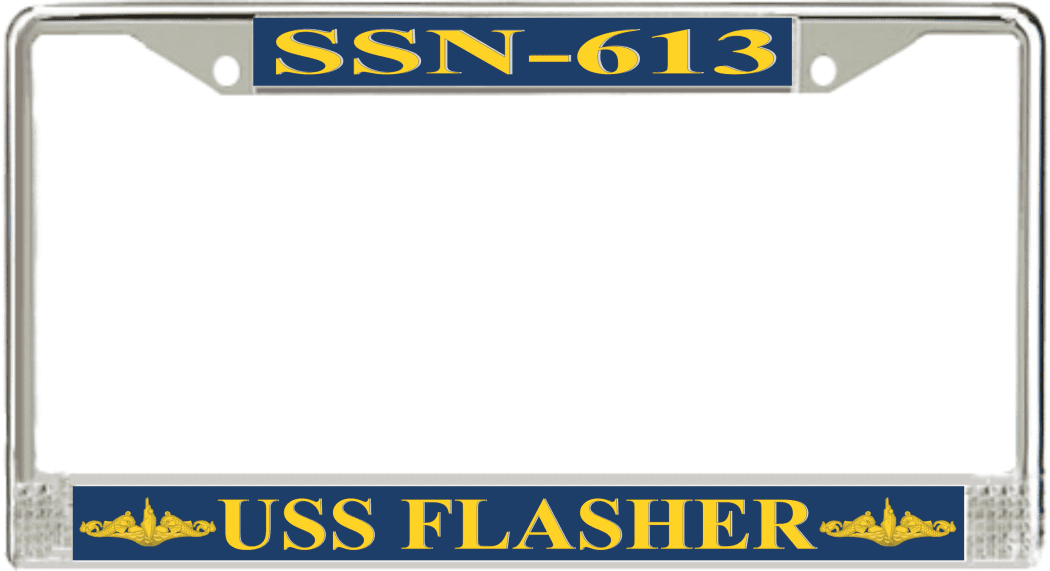 USS Flasher SSN-613 License Plate Frame This USS Flasher SSN-613 License Plate Frame is proudly made in the USA at our facilities in Scottsboro, Alabama. Each Frame features top and bottom sublimated design strips that are poly coated for a protective gloss finish. Please check your state and local regulations for compatibility of these frames for use on your vehicle.