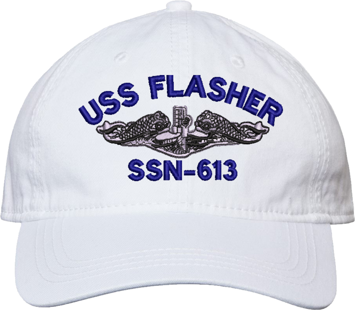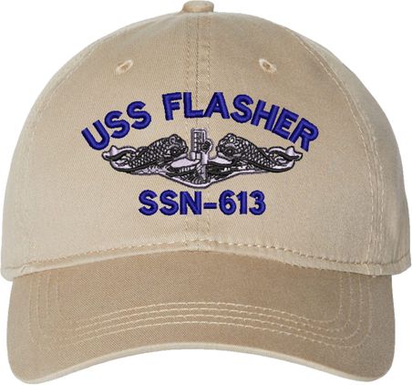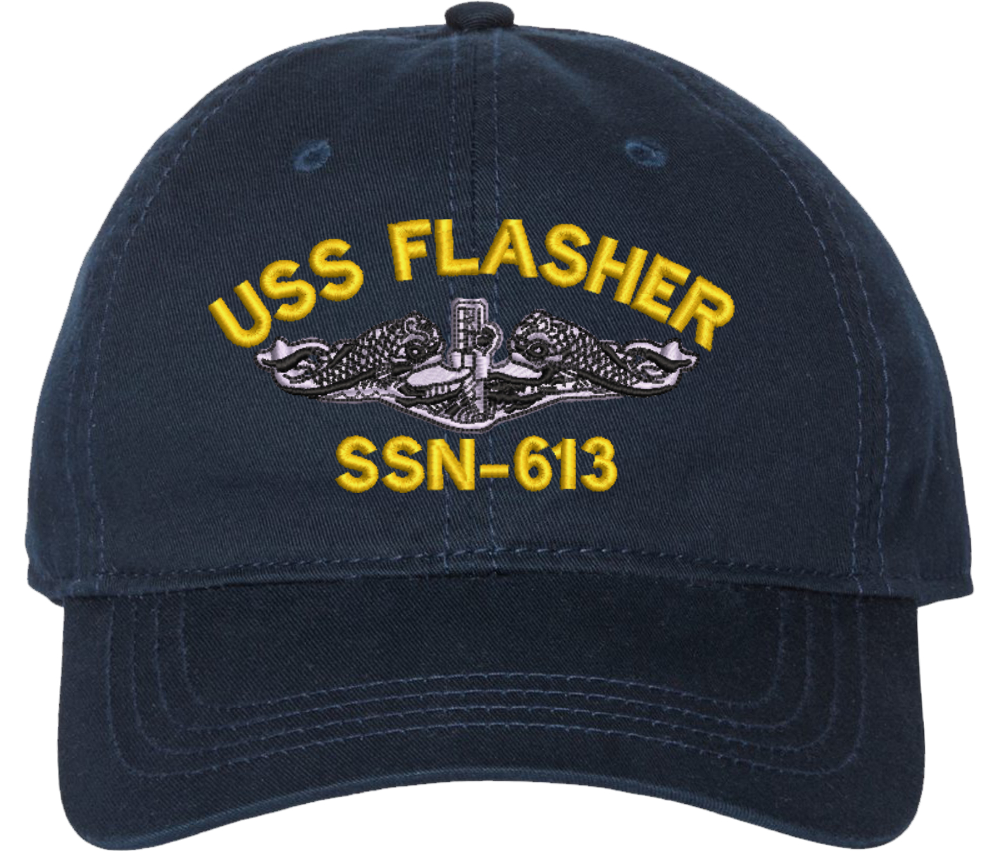 Show your Navy pride with this USS Flasher SSN-613 with Dolphins Unstructured Dad Cap from MilitaryBest. Crafted from 100% washed chino twill cotton, this six-panel, low-profile cap offers a relaxed and comfortable fit. Featuring high-quality embroidery done in our Scottsboro, Alabama facility, this cap is designed with a pre-curved visor and an adjustable tri-glide buckle closure for a perfect fit. Whether for everyday wear or as a meaningful gift, this cap is a great way to honor your own or a loved one's service.For caps ordered with custom embroidered personalized text please allow an additional 3 to 5 days production time. All custom back text will be embroidered in ALL CAPITAL LETTERS. Caps with back text or eggs are non-returnable unless there is a material defect in the cap.
