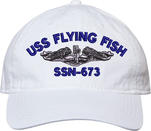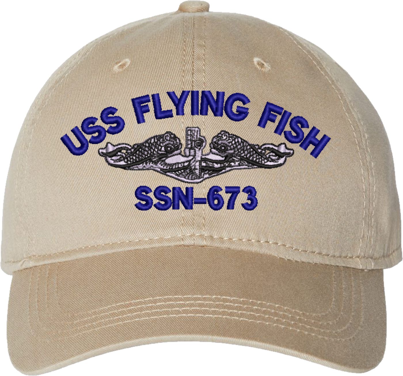 Show your Navy pride with this USS Flying Fish SSN-673 with Dolphins Unstructured Dad Cap from MilitaryBest. Crafted from 100% washed chino twill cotton, this six-panel, low-profile cap offers a relaxed and comfortable fit. Featuring high-quality embroidery done in our Scottsboro, Alabama facility, this cap is designed with a pre-curved visor and an adjustable tri-glide buckle closure for a perfect fit. Whether for everyday wear or as a meaningful gift, this cap is a great way to honor your own or a loved one's service.For caps ordered with custom embroidered personalized text please allow an additional 3 to 5 days production time. All custom back text will be embroidered in ALL CAPITAL LETTERS. Caps with back text or eggs are non-returnable unless there is a material defect in the cap.