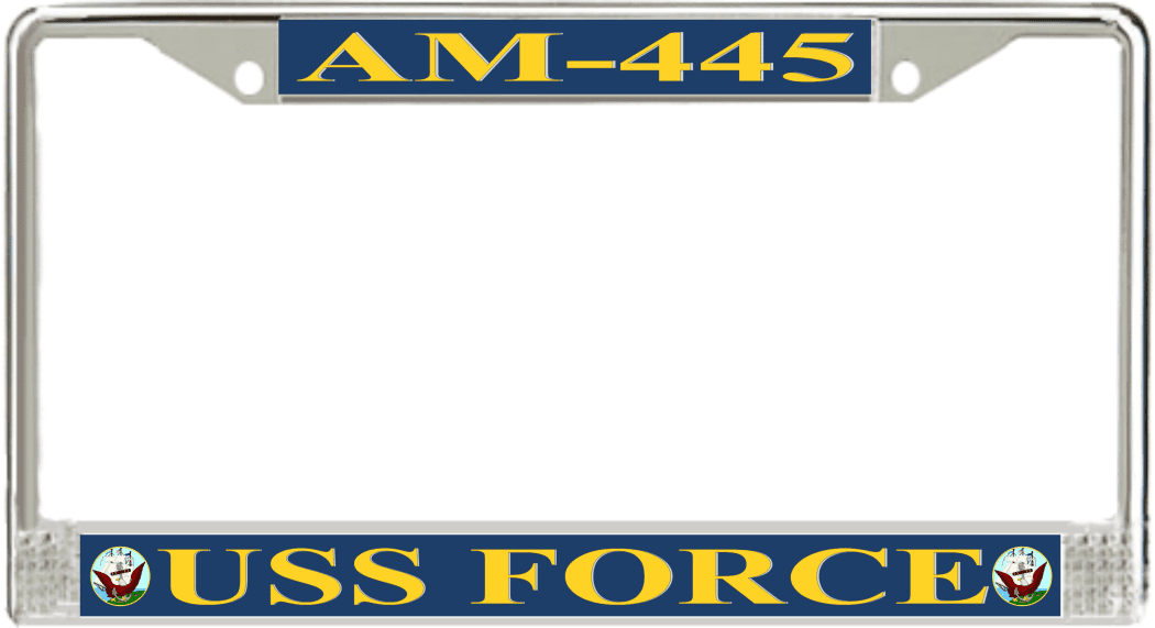 USS Force AM-445 License Plate FrameThis USS Force AM-445 License Plate Frame is proudly made in the USA at our facilities in Scottsboro, Alabama. Each of our MilitaryBest U.S. Navy Frames feature top and bottom Poly Coated Aluminum strips that are printed using sublimation which gives these quality automobile military frames a beautiful high gloss finish.