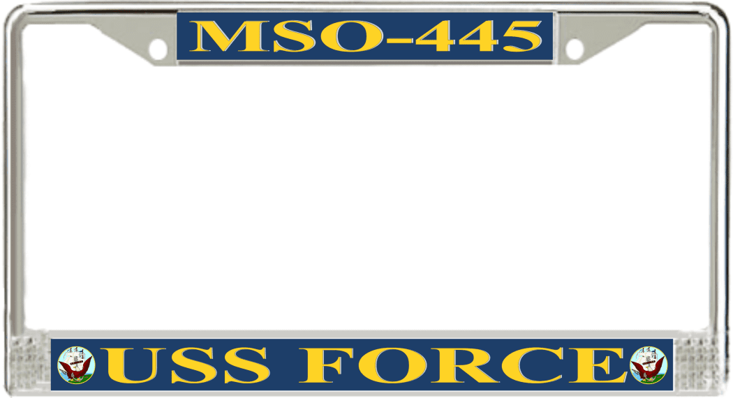 USS Force MSO-445 License Plate FrameThis USS Force MSO-445 License Plate Frame is proudly made in the USA at our facilities in Scottsboro, Alabama. Each of our MilitaryBest U.S. Navy Frames feature top and bottom Poly Coated Aluminum strips that are printed using sublimation which gives these quality automobile military frames a beautiful high gloss finish.