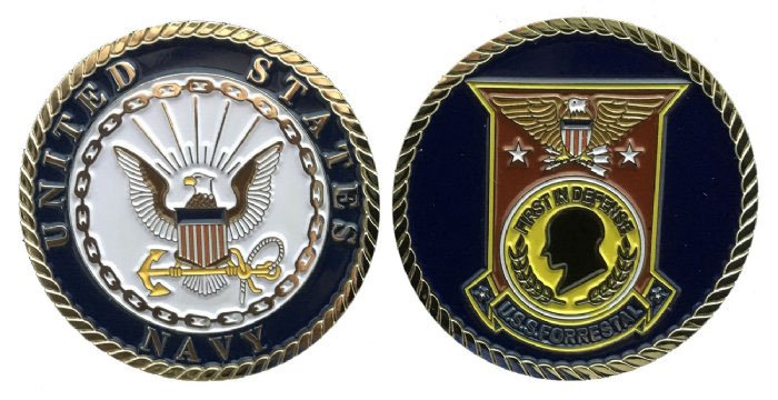 This USS Forrestal Challenge Coin Enlisted measures 1-3/4 inches and is made from a bronze alloy with a brilliantly colored nickel finish. This Challenge Coin would make a wonderful addition to your collection or a great gift. Its quality is guaranteed.Does NOT Fit in Acrylic Single 1 5/8" Challenge Coin Display Case