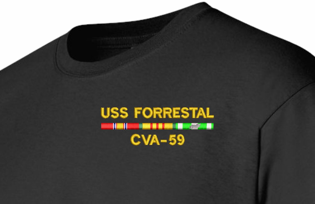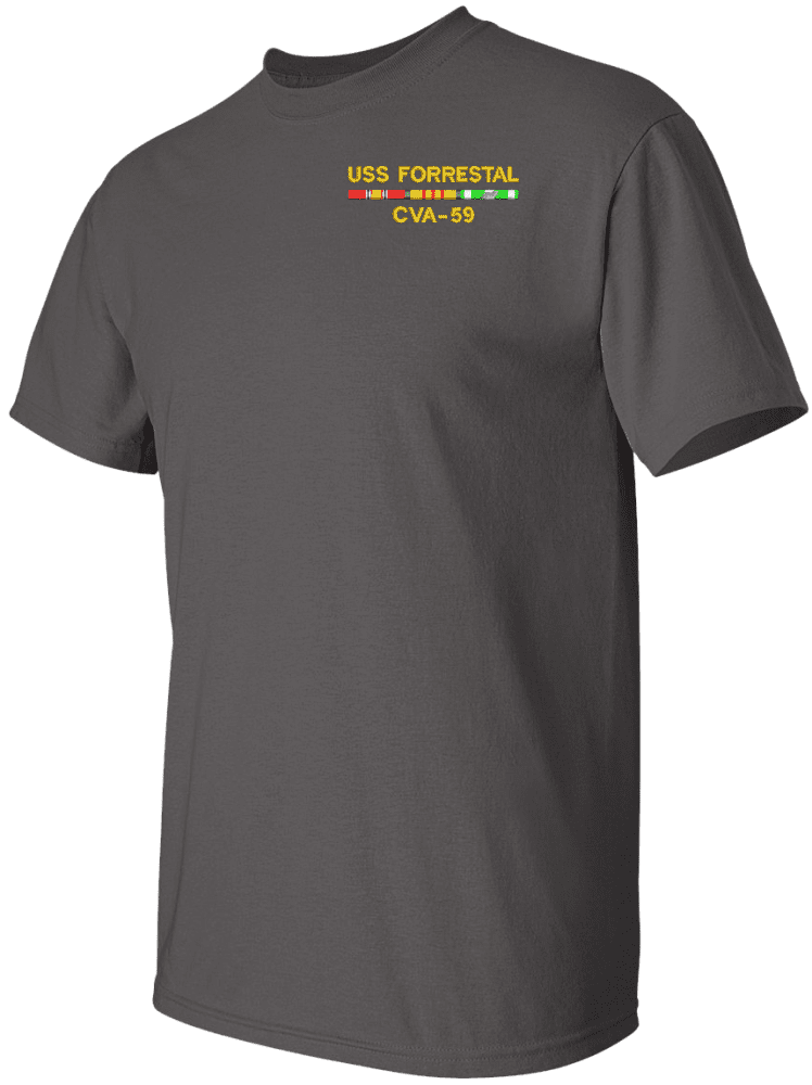 Note: Some of the Color Options pictured may not be available. Available Color Options are listed on the drop down menu above. Yellow colored text is embroidered in black on Khaki Tan and White shirts.MilitaryBest is proud to offer this USS Forrestal CVA-59 with Vietnam Service Ribbons T-Shirt. These quality Military T-Shirts are proudly embroidered at our facilities in Scottsboro, AL. Support the Navy MWR program by purchasing only from Licensed Vendors. To all of our Vietnam Veterans, Welcome Home!