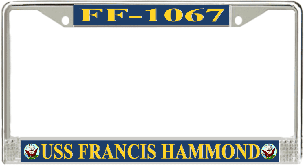 USS Francis Hammond FF-1067 License Plate FrameThis USS Francis Hammond FF-1067 License Plate Frame is proudly made in the USA at our facilities in Scottsboro, Alabama. Each of our MilitaryBest U.S. Navy Frames feature top and bottom Poly Coated Aluminum strips that are printed using sublimation which gives these quality automobile military frames a beautiful high gloss finish.