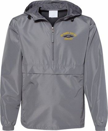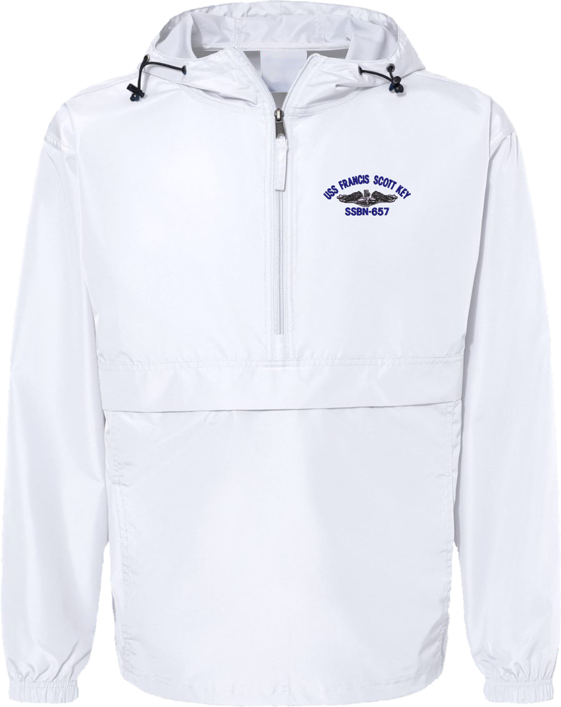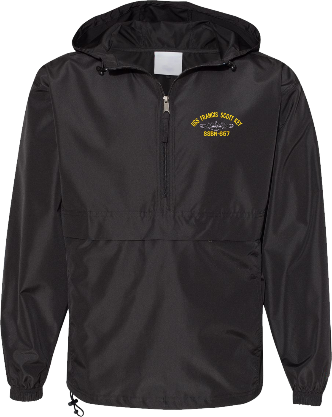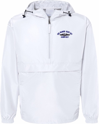 MilitaryBest is proud to offer this quality USS Francis Scott Key SSBN-657 with Dolphins Hooded Windbreaker. Also known as an Anorak Jacket, this windbreaker is designed to keep wind and water out. With a design embroidered over the left chest, this windbreaker is embroidered to order at our facilities in Scottsboro, AL.. This windbreaker can be packed into the mesh lined pouch pocket for a more portable method of storage.- 100% Polyester
