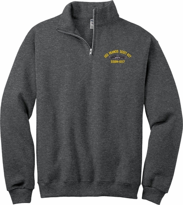 MilitaryBest is proud to offer this USS Francis Scott Key SSBN-657 with Dolphins Embroidered Quarter-Zip Pullover. This quality shirt is embroidered by our MilitaryBest team in Northeast Alabama.PRODUCT FEATURES