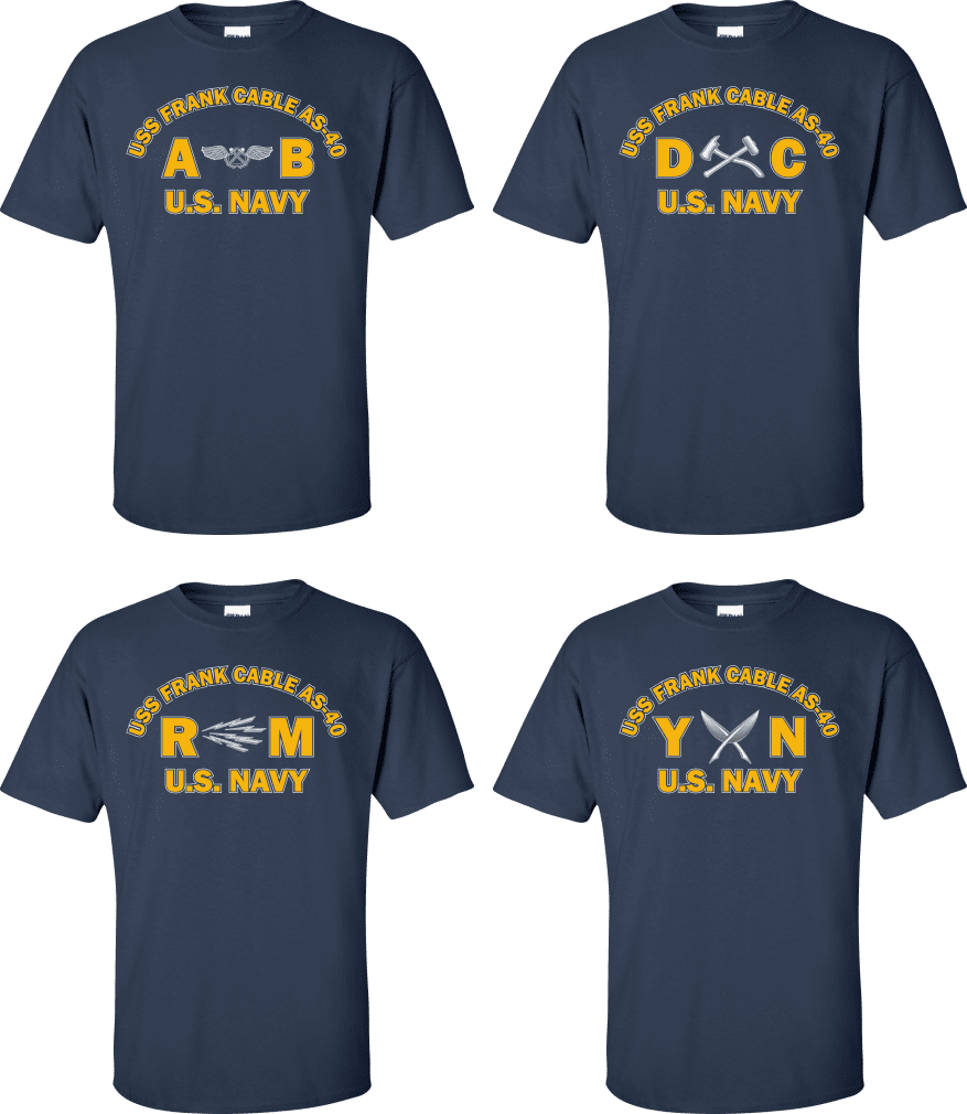 Due to disruptions in supply chains, this design will be embroidered on a Champion, Gildan, Jerzees or comparable brand.Proudly display your ship and rate with our top quality USS FRANK CABLE AS-40 Rates t-shirts, sweatshirts, and hoodies. These fine U.S. Navy apparel items will make you the envy of your veteran buddies, or will make a fine gift! Our USS FRANK CABLE AS-40 shirts are proudly printed in the USA!