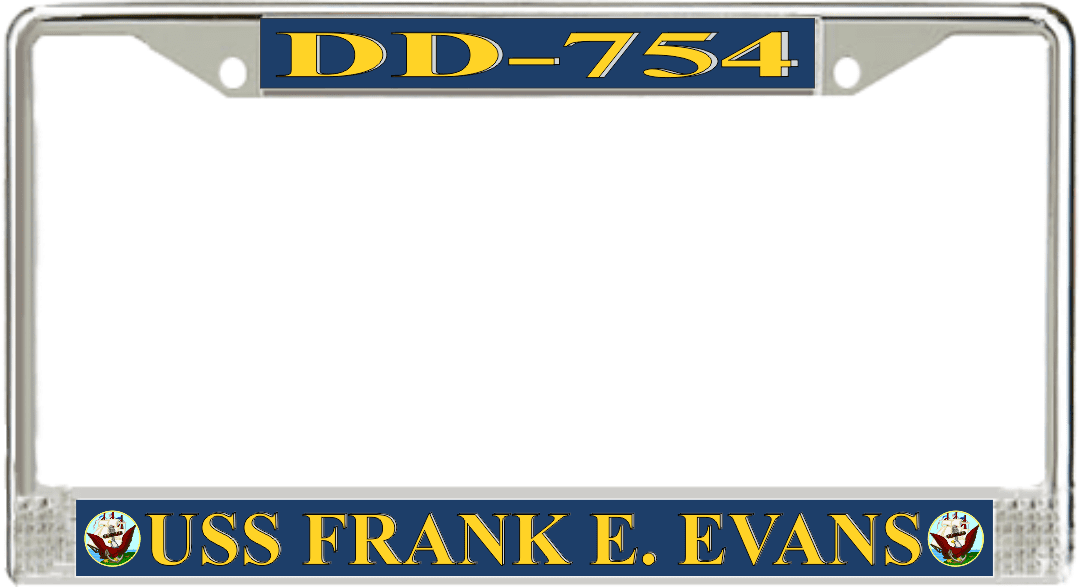 USS Frank E. Evans DD-754 License Plate FrameThis USS Frank E. Evans DD-754 License Plate Frame is proudly made in the USA at our facilities in Scottsboro, Alabama. Each of our MilitaryBest U.S. Navy Frames feature top and bottom Poly Coated Aluminum strips that are printed using sublimation which gives these quality automobile military frames a beautiful high gloss finish.