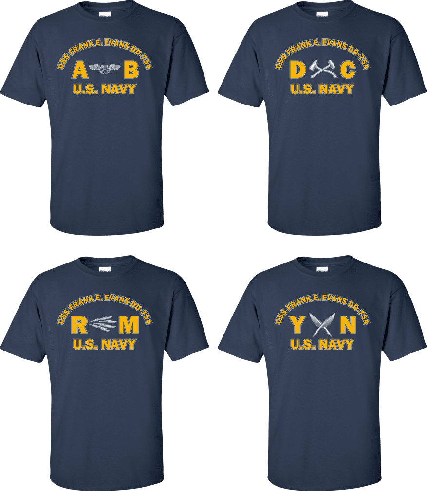 Due to disruptions in supply chains, this design will be embroidered on a Champion, Gildan, Jerzees or comparable brand.Proudly display your ship and rate with our top quality USS FRANK E. EVANS DD-754 Rates t-shirts, sweatshirts, and hoodies. These fine U.S. Navy apparel items will make you the envy of your veteran buddies, or will make a fine gift! Our USS FRANK E. EVANS DD-754 shirts are proudly printed in the USA!