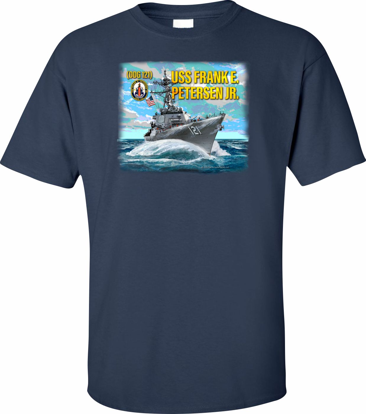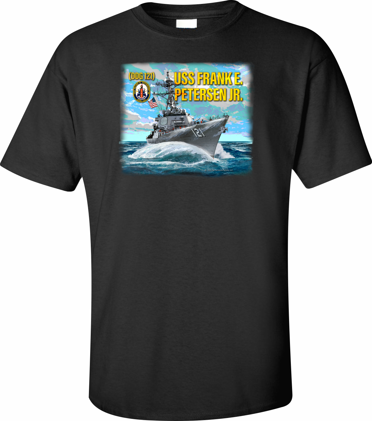 MilitaryBest is proud to offer this fine USS Frank E. Petersen Jr. DDG-121 Printed Art T-Shirt. This shirt features a full front print, with beautiful artwork designed by licensed Navy artist David Hart. This shirt is available in black and navy blue colors. Each T-shirt is proudly printed in the USA.Unless there is a defect in workmanship or material, these shirts are unreturnable.