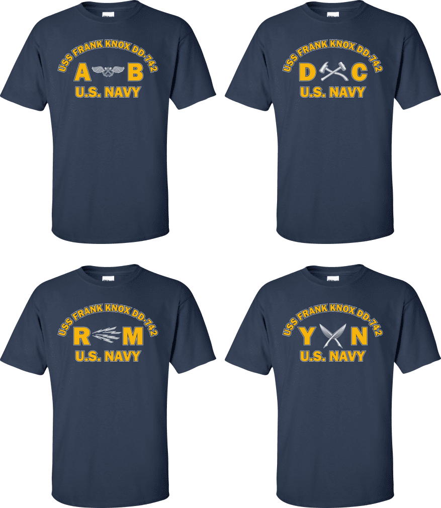 Due to disruptions in supply chains, this design will be embroidered on a Champion, Gildan, Jerzees or comparable brand.Proudly display your ship and rate with our top quality USS FRANK KNOX DD-742 Rates t-shirts, sweatshirts, and hoodies. These fine U.S. Navy apparel items will make you the envy of your veteran buddies, or will make a fine gift! Our USS FRANK KNOX DD-742 shirts are proudly printed in the USA!