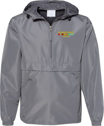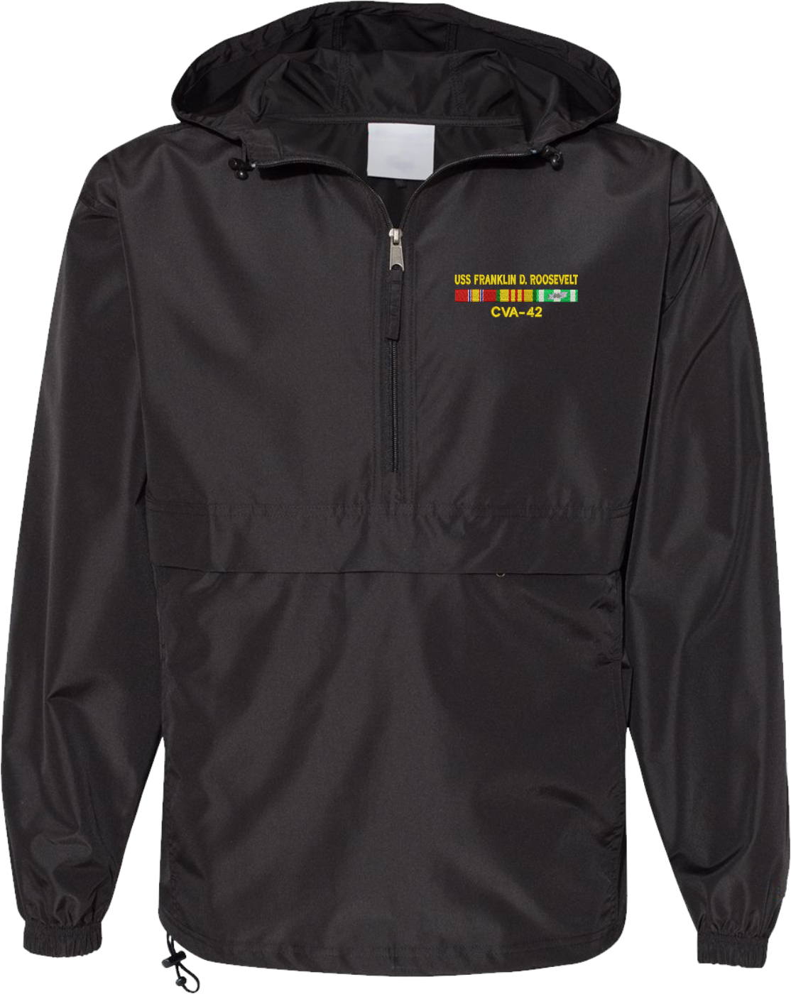 MilitaryBest is proud to offer this quality USS Franklin D. Roosevelt CVA-42 with Vietnam Service Ribbons Hooded Windbreaker. Also known as an Anorak Jacket, this windbreaker is designed to keep wind and water out. With a design embroidered over the left chest, this windbreaker is embroidered to order at our facilities in Scottsboro, AL.. This windbreaker can be packed into the mesh lined pouch pocket for a more portable method of storage.- 100% Polyester