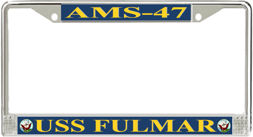 USS Fulmar AMS-47 License Plate Frame This USS Fulmar AMS-47 License Plate Frame is proudly made in the USA at our facilities in Scottsboro, Alabama. Each Frame features top and bottom sublimated design strips that are poly coated for a protective gloss finish. Please check your state and local regulations for compatibility of these frames for use on your vehicle.